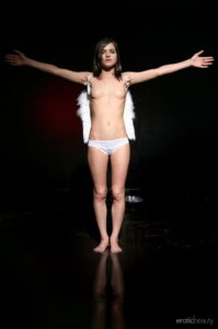 Vestida em asas brancas e macias que adornam seu corpo minúsculo e uma calcinha de renda branca de caba aconchegante, uma delicada beleza e posa no chão molhado, exibindo seu corpo pequeno, porém apertado. Conheça Alice, Angel of Love, de Beautas Eróticas. Esta pequena e pouca encantamento com o rosto fofo e inocente é um deleite visual doce que certamente cumprirá suas fantasias.
