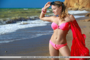 Alessandra parece absolutamente arrebatadora em seu maiô de duas peças rosa, enquanto ela posa e sorri para sua série de estréia. Contra uma costa robusta da praia, ela nos surpreendeu totalmente com uma exposição de suas poses flexíveis e proporções corporais de tirar o fôlego. Além de um corpo magnífico com seios perfeitamente redondos, quadris sexy, bunda apertada e pernas atléticas, também amamos sua diversão e entusiasmo enquanto ela flerta e provoca na frente de Matiss ' lente.