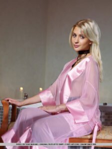 Piper faz um progresso no mundo da erótica usando manto de lilás leve e sedoso que se envolve sexualmente em seu corpo requintado, cinto de liga preta que abraça seus quadris perfeitos e meias pretas pura com enfeites de renda lilás que mostram suas pernas esbeltas.
