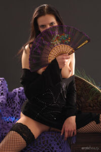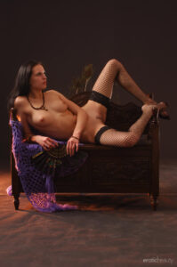 Olhos castanhos penetrantes acentuados por lápis de Kohl Eye, uma blusa preta fora do ombro, meias de peixas altas e altas e cordas de pedras semipreciosas que adornam seu pescoço esbelto e pulso delicado. A estréia de cabelos escuros Valya retrata uma princesa cigana encantadora enquanto se senta em uma cadeira de madeira. Com poses amplas abertas, ela exibe seu corpo magnífico, especialmente sua boceta requintada e Tush firme, redondo.