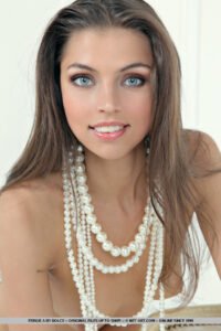 Uma sala branca lisa, uma luxuosa cadeira vitoriana branca e cordas de pérolas brancas acentua o apelo elegante e feminino de Fergie e a beleza semelhante à deusa.