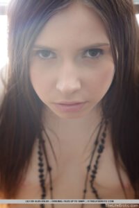 Contra a janela iluminada, Lily mostra sua pele invejável e clara, corpo pequeno com pedaços pequenos, mas rosa e alegre.