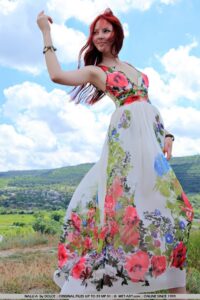Cercado por flores silvestres e grama, a impressionante beleza e fascínio jovem de Nalli se destacam, com sua pele pálida, cabelos ruivos ardentes, rosa, peitos astutos e arbusto não aparado.