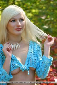 As folhas vermelhas e laranja brilhantes caem aos pés de Lilu como homens sucumbindo a uma deusa ' Beleza, seus cabelos loiros brilhantes e pele super pálida irradiando um brilho saudável, enquanto seus lábios e mamilos rosa inchados evocam um frescor e juventude revigorantes.