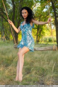 O fundo exuberante e verdejante cria um cenário perfeito para a beleza natural e despreocupada de Mila, sorrindo docemente enquanto ela perde o vestido azul e posa em um balanço de madeira pendurado em uma árvore.