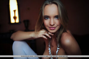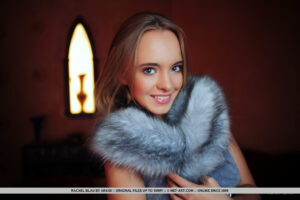 Vestida em um casaco de pele cinza claro, colar de miçangas compridas e meias brancas na altura da coxa, Rachel parece um jetsetter ultra moda enquanto posa contra um luxuoso cenário com tema de Morrocan. O rico tom de vermelho marrom e profundo cria o fundo perfeito para este atordoante de olhos azuis. Com um ótimo sorriso, ela tira todas as roupas e começa a exibir seus mamilos inchados e cremoso para a câmera de Arkisi.