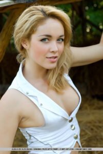A quarta série ao ar livre do fotógrafo Alex Iskan, apresentando a Alisa, sem esforço, seu corpo nu, esparramado e bem aberto entre a grama e o feno.
