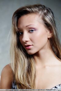 Lucy senta -se com as pernas abertas em uma cadeira parecida com uma grande casca de vieira, revelando seus lábios suaves e requintadamente aparados.