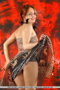 Nadya garante que seus melhores bens, suas pernas longas e perfeitamente formadas tomem o holofotor enquanto ela se apresenta sedutoramente na frente de um fundo vermelho ardente.